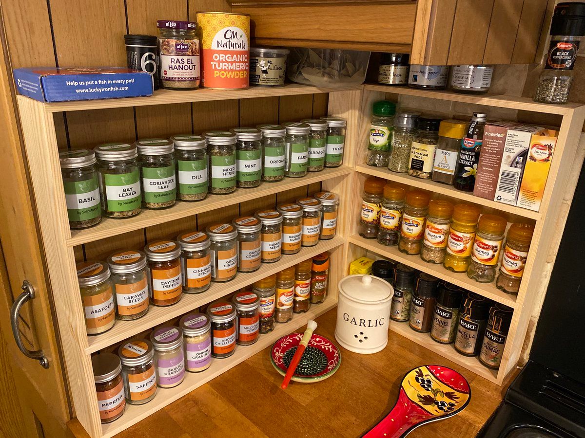 More satisfied than I probably should be with my new spice rack arrangement. Amazes me when I see spice racks on sale that hold fewer than 10 jars…