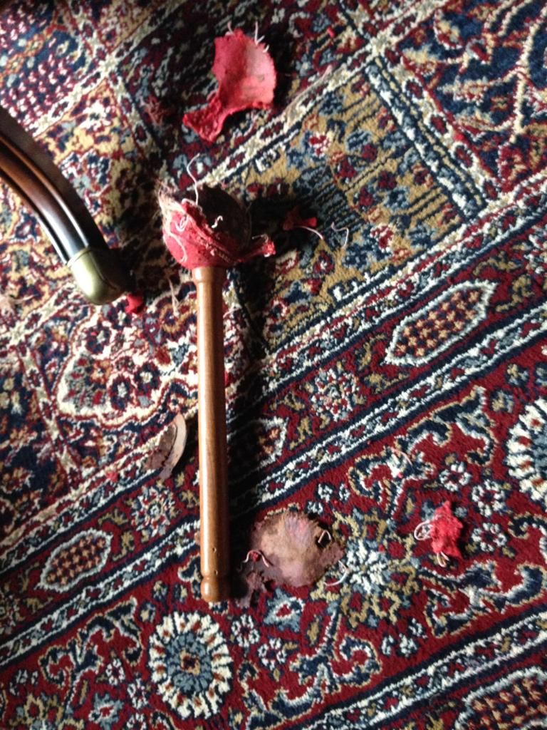 Bad dog found my cricket bat mallet. In his defence, though: BALL ON A STICK!!!